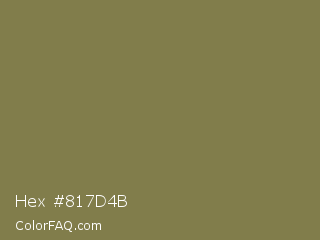 Hex #817d4b Color is a normal yellow color and the nearest color is Gold Fusion #85754e. Hex code #817d4b and RGB value is rgb(129,125,75). In RGB color space, this color is composed of 51% red, 49% green, 29% blue, In CMYK color space, this color is composed of 0% cyan, 3% magenta, 42% yellow , 49% black , In HSL color space, this color has a hue angle of 56° , 26% saturation and 40% lightness.