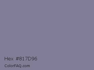 Hex #817d96 Color is a normal indigo color and the nearest color is Waterloo #7b7c94. Hex code #817d96 and RGB value is rgb(129,125,150). In RGB color space, this color is composed of 51% red, 49% green, 59% blue, In CMYK color space, this color is composed of 14% cyan, 17% magenta, 0% yellow , 41% black , In HSL color space, this color has a hue angle of 250° , 11% saturation and 54% lightness.