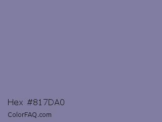 Hex #817da0 Color is a normal indigo color and the nearest color is Waterloo #7b7c94. Hex code #817da0 and RGB value is rgb(129,125,160). In RGB color space, this color is composed of 51% red, 49% green, 63% blue, In CMYK color space, this color is composed of 19% cyan, 22% magenta, 0% yellow , 37% black , In HSL color space, this color has a hue angle of 247° , 16% saturation and 56% lightness.