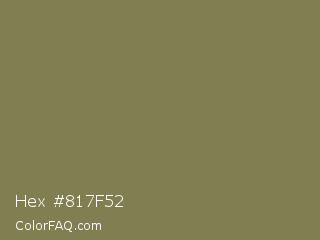 Hex #817f52 Color is a normal yellow color and the nearest color is Gold Fusion #85754e. Hex code #817f52 and RGB value is rgb(129,127,82). In RGB color space, this color is composed of 51% red, 50% green, 32% blue, In CMYK color space, this color is composed of 0% cyan, 2% magenta, 36% yellow , 49% black , In HSL color space, this color has a hue angle of 57° , 22% saturation and 41% lightness.