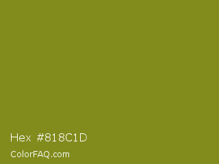Hex #818c1d Color is a normal yellow color and the nearest color is Trendy Green #7c881a. Hex code #818c1d and RGB value is rgb(129,140,29). In RGB color space, this color is composed of 51% red, 55% green, 11% blue, In CMYK color space, this color is composed of 8% cyan, 0% magenta, 79% yellow , 45% black , In HSL color space, this color has a hue angle of 66° , 66% saturation and 33% lightness.
