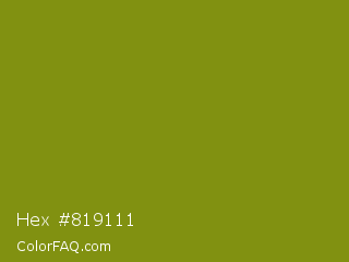 Hex #819111 Color is a normal yellow color and the nearest color is Trendy Green #7c881a. Hex code #819111 and RGB value is rgb(129,145,17). In RGB color space, this color is composed of 51% red, 57% green, 7% blue, In CMYK color space, this color is composed of 11% cyan, 0% magenta, 88% yellow , 43% black , In HSL color space, this color has a hue angle of 68° , 79% saturation and 32% lightness.