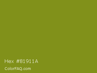 Hex #81911a Color is a normal yellow color and the nearest color is Trendy Green #7c881a. Hex code #81911a and RGB value is rgb(129,145,26). In RGB color space, this color is composed of 51% red, 57% green, 10% blue, In CMYK color space, this color is composed of 11% cyan, 0% magenta, 82% yellow , 43% black , In HSL color space, this color has a hue angle of 68° , 70% saturation and 34% lightness.