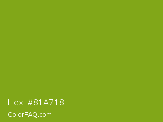 Hex #81a718 Color is a normal lime color and the nearest color is Lima #76bd17. Hex code #81a718 and RGB value is rgb(129,167,24). In RGB color space, this color is composed of 51% red, 65% green, 9% blue, In CMYK color space, this color is composed of 23% cyan, 0% magenta, 86% yellow , 35% black , In HSL color space, this color has a hue angle of 76° , 75% saturation and 37% lightness.