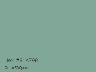 Hex #81a798 Color is a normal green color and the nearest color is Sea Nymph #78a39c. Hex code #81a798 and RGB value is rgb(129,167,152). In RGB color space, this color is composed of 51% red, 65% green, 60% blue, In CMYK color space, this color is composed of 23% cyan, 0% magenta, 9% yellow , 35% black , In HSL color space, this color has a hue angle of 156° , 18% saturation and 58% lightness.