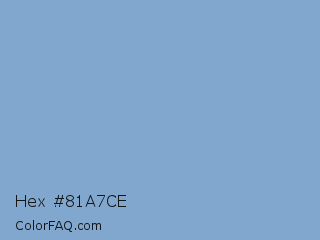 Hex #81a7ce Color is a light blue color and the nearest color is Polo Blue #8da8cc. Hex code #81a7ce and RGB value is rgb(129,167,206). In RGB color space, this color is composed of 51% red, 65% green, 81% blue, In CMYK color space, this color is composed of 37% cyan, 19% magenta, 0% yellow , 19% black , In HSL color space, this color has a hue angle of 210° , 44% saturation and 66% lightness.