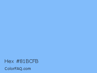 Hex #81bcfb Color is a light blue color and the nearest color is French Sky Blue #77b5fe. Hex code #81bcfb and RGB value is rgb(129,188,251). In RGB color space, this color is composed of 51% red, 74% green, 98% blue, In CMYK color space, this color is composed of 49% cyan, 25% magenta, 0% yellow , 2% black , In HSL color space, this color has a hue angle of 211° , 94% saturation and 75% lightness.