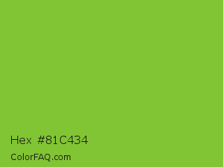 Hex #81c434 Color is a normal green color and the nearest color is Atlantis #97cd2d. Hex code #81c434 and RGB value is rgb(129,196,52). In RGB color space, this color is composed of 51% red, 77% green, 20% blue, In CMYK color space, this color is composed of 34% cyan, 0% magenta, 73% yellow , 23% black , In HSL color space, this color has a hue angle of 88° , 58% saturation and 49% lightness.