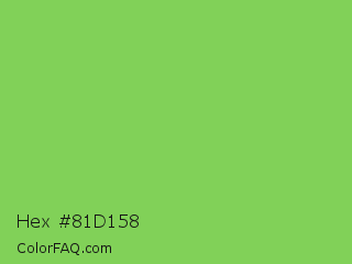 Hex #81d158 Color is a normal green color and the nearest color is Mantis #74c365. Hex code #81d158 and RGB value is rgb(129,209,88). In RGB color space, this color is composed of 51% red, 82% green, 35% blue, In CMYK color space, this color is composed of 38% cyan, 0% magenta, 58% yellow , 18% black , In HSL color space, this color has a hue angle of 100° , 57% saturation and 58% lightness.