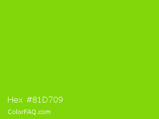 Hex #81d709 Color is a normal green color and the nearest color is Alien Armpit #84de02. Hex code #81d709 and RGB value is rgb(129,215,9). In RGB color space, this color is composed of 51% red, 84% green, 4% blue, In CMYK color space, this color is composed of 40% cyan, 0% magenta, 96% yellow , 16% black , In HSL color space, this color has a hue angle of 85° , 92% saturation and 44% lightness.