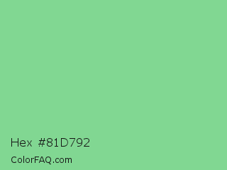 Hex #81d792 Color is a light green color and the nearest color is De York #7ac488. Hex code #81d792 and RGB value is rgb(129,215,146). In RGB color space, this color is composed of 51% red, 84% green, 57% blue, In CMYK color space, this color is composed of 40% cyan, 0% magenta, 32% yellow , 16% black , In HSL color space, this color has a hue angle of 132° , 52% saturation and 67% lightness.