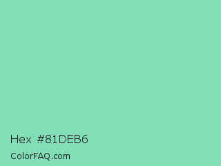 Hex #81deb6 Color is a light green color and the nearest color is Pearl Aqua #88d8c0. Hex code #81deb6 and RGB value is rgb(129,222,182). In RGB color space, this color is composed of 51% red, 87% green, 71% blue, In CMYK color space, this color is composed of 42% cyan, 0% magenta, 18% yellow , 13% black , In HSL color space, this color has a hue angle of 154° , 58% saturation and 69% lightness.