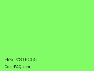 Hex #81fc66 Color is a light green color and the nearest color is Screamin Green #66ff66. Hex code #81fc66 and RGB value is rgb(129,252,102). In RGB color space, this color is composed of 51% red, 99% green, 40% blue, In CMYK color space, this color is composed of 49% cyan, 0% magenta, 60% yellow , 1% black , In HSL color space, this color has a hue angle of 109° , 96% saturation and 69% lightness.