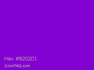 Hex #8202d1 Color is a normal purple color and the nearest color is French Violet #8806ce. Hex code #8202d1 and RGB value is rgb(130,2,209). In RGB color space, this color is composed of 51% red, 1% green, 82% blue, In CMYK color space, this color is composed of 38% cyan, 99% magenta, 0% yellow , 18% black , In HSL color space, this color has a hue angle of 277° , 98% saturation and 41% lightness.