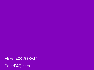 Hex #8203bd Color is a normal purple color and the nearest color is Violet RYB #8601af. Hex code #8203bd and RGB value is rgb(130,3,189). In RGB color space, this color is composed of 51% red, 1% green, 74% blue, In CMYK color space, this color is composed of 31% cyan, 98% magenta, 0% yellow , 26% black , In HSL color space, this color has a hue angle of 281° , 97% saturation and 38% lightness.