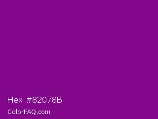 Hex #82078b Color is a dark magenta color and the nearest color is Mardi Gras #880085. Hex code #82078b and RGB value is rgb(130,7,139). In RGB color space, this color is composed of 51% red, 3% green, 55% blue, In CMYK color space, this color is composed of 6% cyan, 95% magenta, 0% yellow , 45% black , In HSL color space, this color has a hue angle of 296° , 90% saturation and 29% lightness.