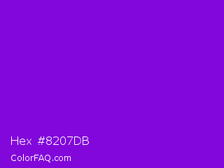Hex #8207db Color is a normal purple color and the nearest color is French Violet #8806ce. Hex code #8207db and RGB value is rgb(130,7,219). In RGB color space, this color is composed of 51% red, 3% green, 86% blue, In CMYK color space, this color is composed of 41% cyan, 97% magenta, 0% yellow , 14% black , In HSL color space, this color has a hue angle of 275° , 94% saturation and 44% lightness.