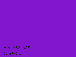 Hex #8216cf Color is a normal purple color and the nearest color is French Violet #8806ce. Hex code #8216cf and RGB value is rgb(130,22,207). In RGB color space, this color is composed of 51% red, 9% green, 81% blue, In CMYK color space, this color is composed of 37% cyan, 89% magenta, 0% yellow , 19% black , In HSL color space, this color has a hue angle of 275° , 81% saturation and 45% lightness.