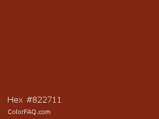 Hex #822711 Color is a dark red color and the nearest color is Smokey Topaz #832a0d. Hex code #822711 and RGB value is rgb(130,39,17). In RGB color space, this color is composed of 51% red, 15% green, 7% blue, In CMYK color space, this color is composed of 0% cyan, 70% magenta, 87% yellow , 49% black , In HSL color space, this color has a hue angle of 12° , 77% saturation and 29% lightness.