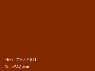 Hex #822901 Color is a dark orange color and the nearest color is Smokey Topaz #832a0d. Hex code #822901 and RGB value is rgb(130,41,1). In RGB color space, this color is composed of 51% red, 16% green, 0% blue, In CMYK color space, this color is composed of 0% cyan, 68% magenta, 99% yellow , 49% black , In HSL color space, this color has a hue angle of 19° , 98% saturation and 26% lightness.