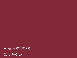 Hex #822938 Color is a normal red color and the nearest color is Wine #722f37. Hex code #822938 and RGB value is rgb(130,41,56). In RGB color space, this color is composed of 51% red, 16% green, 22% blue, In CMYK color space, this color is composed of 0% cyan, 68% magenta, 57% yellow , 49% black , In HSL color space, this color has a hue angle of 350° , 52% saturation and 34% lightness.