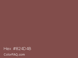Hex #824d4b Color is a normal red color and the nearest color is Tuscan Red #7c4848. Hex code #824d4b and RGB value is rgb(130,77,75). In RGB color space, this color is composed of 51% red, 30% green, 29% blue, In CMYK color space, this color is composed of 0% cyan, 41% magenta, 42% yellow , 49% black , In HSL color space, this color has a hue angle of 2° , 27% saturation and 40% lightness.