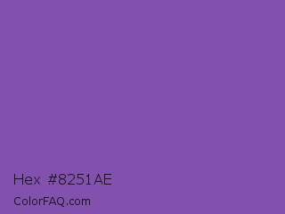 Hex #8251ae Color is a normal purple color and the nearest color is Royal Purple #7851a9. Hex code #8251ae and RGB value is rgb(130,81,174). In RGB color space, this color is composed of 51% red, 32% green, 68% blue, In CMYK color space, this color is composed of 25% cyan, 53% magenta, 0% yellow , 32% black , In HSL color space, this color has a hue angle of 272° , 36% saturation and 50% lightness.