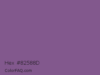 Hex #82588d Color is a normal purple color and the nearest color is French Lilac #86608e. Hex code #82588d and RGB value is rgb(130,88,141). In RGB color space, this color is composed of 51% red, 35% green, 55% blue, In CMYK color space, this color is composed of 8% cyan, 38% magenta, 0% yellow , 45% black , In HSL color space, this color has a hue angle of 288° , 23% saturation and 45% lightness.