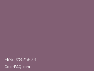 Hex #825f74 Color is a normal magenta color and the nearest color is Falcon #7f626d. Hex code #825f74 and RGB value is rgb(130,95,116). In RGB color space, this color is composed of 51% red, 37% green, 45% blue, In CMYK color space, this color is composed of 0% cyan, 27% magenta, 11% yellow , 49% black , In HSL color space, this color has a hue angle of 324° , 16% saturation and 44% lightness.