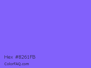 Hex #8261fb Color is a light indigo color and the nearest color is Medium Slate Blue #7b68ee. Hex code #8261fb and RGB value is rgb(130,97,251). In RGB color space, this color is composed of 51% red, 38% green, 98% blue, In CMYK color space, this color is composed of 48% cyan, 61% magenta, 0% yellow , 2% black , In HSL color space, this color has a hue angle of 253° , 95% saturation and 68% lightness.