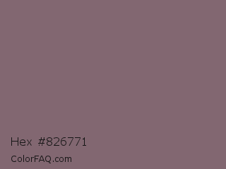 Hex #826771 Color is a normal rose color and the nearest color is Falcon #7f626d. Hex code #826771 and RGB value is rgb(130,103,113). In RGB color space, this color is composed of 51% red, 40% green, 44% blue, In CMYK color space, this color is composed of 0% cyan, 21% magenta, 13% yellow , 49% black , In HSL color space, this color has a hue angle of 338° , 12% saturation and 46% lightness.