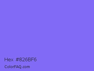 Hex #826bf6 Color is a light indigo color and the nearest color is Medium Slate Blue #7b68ee. Hex code #826bf6 and RGB value is rgb(130,107,246). In RGB color space, this color is composed of 51% red, 42% green, 96% blue, In CMYK color space, this color is composed of 47% cyan, 57% magenta, 0% yellow , 4% black , In HSL color space, this color has a hue angle of 250° , 89% saturation and 69% lightness.