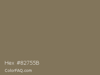 Hex #82755b Color is a normal orange color and the nearest color is Shadow #8a795d. Hex code #82755b and RGB value is rgb(130,117,91). In RGB color space, this color is composed of 51% red, 46% green, 36% blue, In CMYK color space, this color is composed of 0% cyan, 10% magenta, 30% yellow , 49% black , In HSL color space, this color has a hue angle of 40° , 18% saturation and 43% lightness.