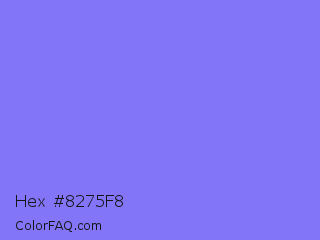Hex #8275f8 Color is a light indigo color and the nearest color is Medium Slate Blue #7b68ee. Hex code #8275f8 and RGB value is rgb(130,117,248). In RGB color space, this color is composed of 51% red, 46% green, 97% blue, In CMYK color space, this color is composed of 48% cyan, 53% magenta, 0% yellow , 3% black , In HSL color space, this color has a hue angle of 246° , 90% saturation and 72% lightness.