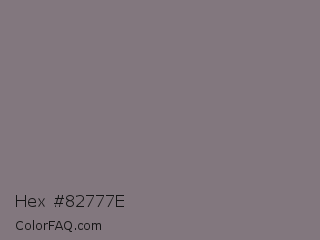 Hex #82777e Color is a normal magenta color and the nearest color is Hurricane #877c7b. Hex code #82777e and RGB value is rgb(130,119,126). In RGB color space, this color is composed of 51% red, 47% green, 49% blue, In CMYK color space, this color is composed of 0% cyan, 8% magenta, 3% yellow , 49% black , In HSL color space, this color has a hue angle of 322° , 4% saturation and 49% lightness.