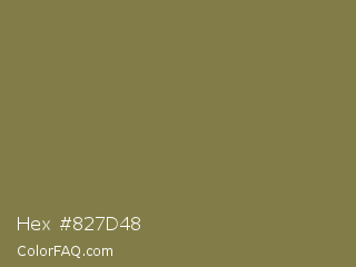Hex #827d48 Color is a normal yellow color and the nearest color is Gold Fusion #85754e. Hex code #827d48 and RGB value is rgb(130,125,72). In RGB color space, this color is composed of 51% red, 49% green, 28% blue, In CMYK color space, this color is composed of 0% cyan, 4% magenta, 45% yellow , 49% black , In HSL color space, this color has a hue angle of 55° , 29% saturation and 40% lightness.