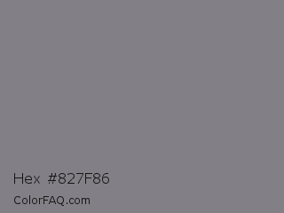 Hex #827f86 Color is a normal violet color and the nearest color is Gray #808080. Hex code #827f86 and RGB value is rgb(130,127,134). In RGB color space, this color is composed of 51% red, 50% green, 53% blue, In CMYK color space, this color is composed of 3% cyan, 5% magenta, 0% yellow , 47% black , In HSL color space, this color has a hue angle of 266° , 3% saturation and 51% lightness.