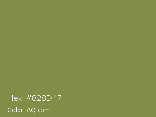 Hex #828d47 Color is a normal yellow color and the nearest color is Sycamore #908d39. Hex code #828d47 and RGB value is rgb(130,141,71). In RGB color space, this color is composed of 51% red, 55% green, 28% blue, In CMYK color space, this color is composed of 8% cyan, 0% magenta, 50% yellow , 45% black , In HSL color space, this color has a hue angle of 69° , 33% saturation and 42% lightness.