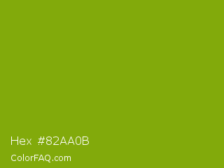 Hex #82aa0b Color is a normal lime color and the nearest color is Apple Green #8db600. Hex code #82aa0b and RGB value is rgb(130,170,11). In RGB color space, this color is composed of 51% red, 67% green, 4% blue, In CMYK color space, this color is composed of 24% cyan, 0% magenta, 94% yellow , 33% black , In HSL color space, this color has a hue angle of 75° , 88% saturation and 35% lightness.