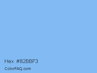 Hex #82bbf3 Color is a light blue color and the nearest color is Jordy Blue #8ab9f1. Hex code #82bbf3 and RGB value is rgb(130,187,243). In RGB color space, this color is composed of 51% red, 73% green, 95% blue, In CMYK color space, this color is composed of 47% cyan, 23% magenta, 0% yellow , 5% black , In HSL color space, this color has a hue angle of 210° , 82% saturation and 73% lightness.
