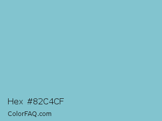 Hex #82c4cf Color is a light cyan color and the nearest color is Half Baked #85c4cc. Hex code #82c4cf and RGB value is rgb(130,196,207). In RGB color space, this color is composed of 51% red, 77% green, 81% blue, In CMYK color space, this color is composed of 37% cyan, 5% magenta, 0% yellow , 19% black , In HSL color space, this color has a hue angle of 189° , 45% saturation and 66% lightness.