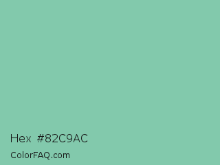 Hex #82c9ac Color is a light green color and the nearest color is Vista Blue #8fd6b4. Hex code #82c9ac and RGB value is rgb(130,201,172). In RGB color space, this color is composed of 51% red, 79% green, 67% blue, In CMYK color space, this color is composed of 35% cyan, 0% magenta, 14% yellow , 21% black , In HSL color space, this color has a hue angle of 155° , 40% saturation and 65% lightness.