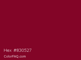 Hex #830527 Color is a dark rose color and the nearest color is Burgundy #800020. Hex code #830527 and RGB value is rgb(131,5,39). In RGB color space, this color is composed of 51% red, 2% green, 15% blue, In CMYK color space, this color is composed of 0% cyan, 96% magenta, 70% yellow , 49% black , In HSL color space, this color has a hue angle of 344° , 93% saturation and 27% lightness.