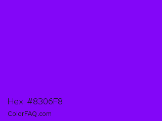 Hex #8306f8 Color is a normal purple color and the nearest color is Violet Color Wheel #7f00ff. Hex code #8306f8 and RGB value is rgb(131,6,248). In RGB color space, this color is composed of 51% red, 2% green, 97% blue, In CMYK color space, this color is composed of 47% cyan, 98% magenta, 0% yellow , 3% black , In HSL color space, this color has a hue angle of 271° , 95% saturation and 50% lightness.