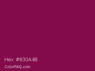 Hex #830a4b Color is a dark rose color and the nearest color is Rose Bud Cherry #800b47. Hex code #830a4b and RGB value is rgb(131,10,75). In RGB color space, this color is composed of 51% red, 4% green, 29% blue, In CMYK color space, this color is composed of 0% cyan, 92% magenta, 43% yellow , 49% black , In HSL color space, this color has a hue angle of 328° , 86% saturation and 28% lightness.
