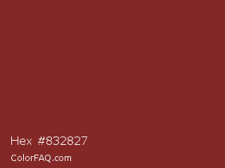 Hex #832827 Color is a normal red color and the nearest color is Burnt Umber #8a3324. Hex code #832827 and RGB value is rgb(131,40,39). In RGB color space, this color is composed of 51% red, 16% green, 15% blue, In CMYK color space, this color is composed of 0% cyan, 69% magenta, 70% yellow , 49% black , In HSL color space, this color has a hue angle of 1° , 54% saturation and 33% lightness.