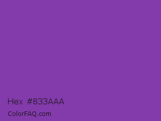 Hex #833aaa Color is a normal purple color and the nearest color is Grape #6f2da8. Hex code #833aaa and RGB value is rgb(131,58,170). In RGB color space, this color is composed of 51% red, 23% green, 67% blue, In CMYK color space, this color is composed of 23% cyan, 66% magenta, 0% yellow , 33% black , In HSL color space, this color has a hue angle of 279° , 49% saturation and 45% lightness.