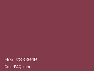 Hex #833b4b Color is a normal red color and the nearest color is Cordovan #893f45. Hex code #833b4b and RGB value is rgb(131,59,75). In RGB color space, this color is composed of 51% red, 23% green, 29% blue, In CMYK color space, this color is composed of 0% cyan, 55% magenta, 43% yellow , 49% black , In HSL color space, this color has a hue angle of 347° , 38% saturation and 37% lightness.
