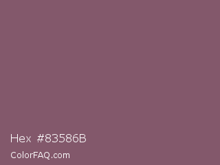 Hex #83586b Color is a normal rose color and the nearest color is Falcon #7f626d. Hex code #83586b and RGB value is rgb(131,88,107). In RGB color space, this color is composed of 51% red, 35% green, 42% blue, In CMYK color space, this color is composed of 0% cyan, 33% magenta, 18% yellow , 49% black , In HSL color space, this color has a hue angle of 333° , 20% saturation and 43% lightness.