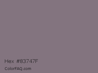 Hex #83747f Color is a normal magenta color and the nearest color is Empress #817377. Hex code #83747f and RGB value is rgb(131,116,127). In RGB color space, this color is composed of 51% red, 45% green, 50% blue, In CMYK color space, this color is composed of 0% cyan, 11% magenta, 3% yellow , 49% black , In HSL color space, this color has a hue angle of 316° , 6% saturation and 48% lightness.